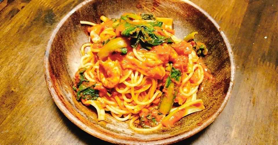 小巻エビと小松菜のトマトパスタ 彩りあるランチパスタ ふぁに Note